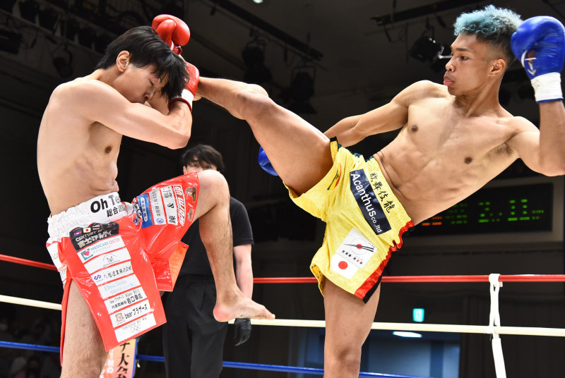 元Krush王者・山際(左)に勝利したプロ5戦目の寧仁太(右)