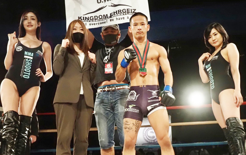 23歳の若手、キングダム新井丈が世界3位の飯野に秒殺勝利しRIZIN参戦アピール。後ろで旗を持つのはキングダムエルガイツの入江代表