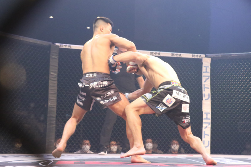 開始早々、尾崎の右フックで山北は腰が落ちるピンチに