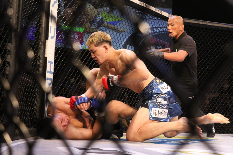 崩れ落ちた三浦へ菊入は追撃のパウンドを降らせる