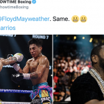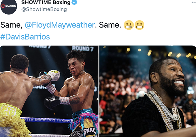 愛弟子デービス(左・白グローブ)に檄を飛ばすメイウェザー@ShowtimeBoxingより