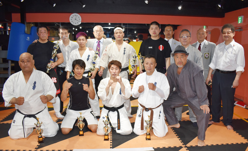 大会入賞者たちと。士道館の添野義二会長や村上竜司師範も出席