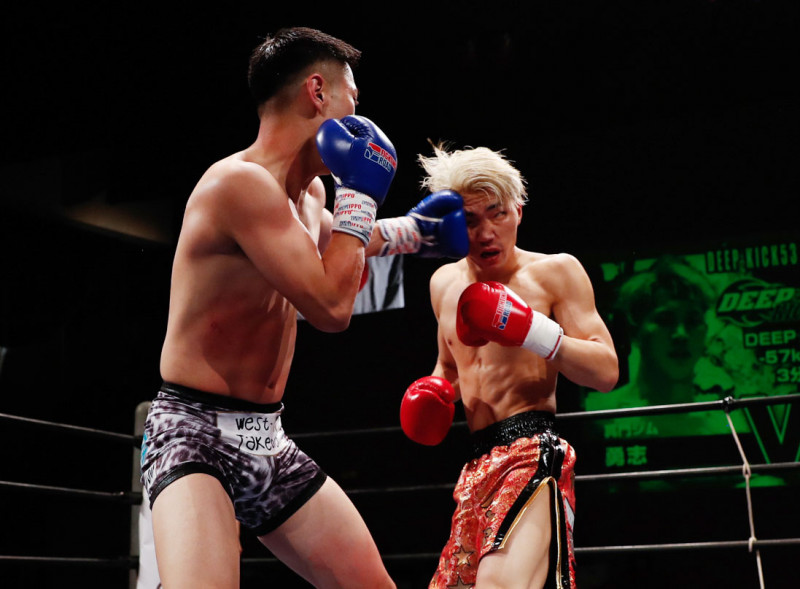 強烈な左をヒットさせる久津輪(左)