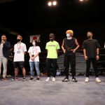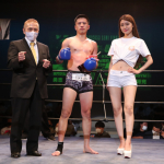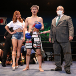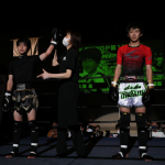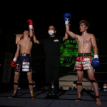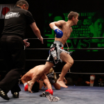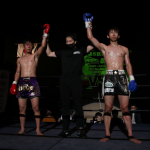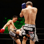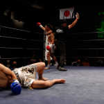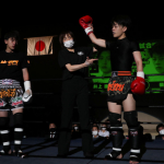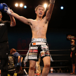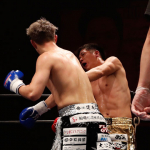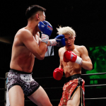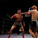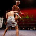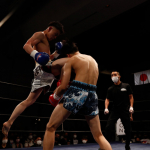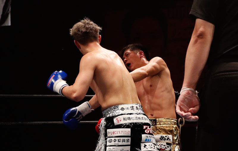 右のパンチを思いきりヒットさせる稲井(左)