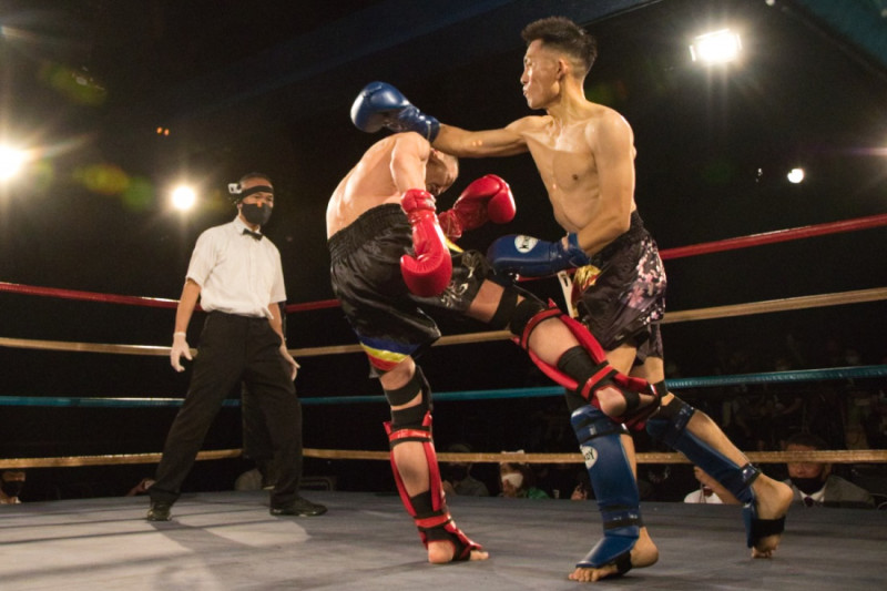 1R、難波(右)の右ストレートをかわしながら右ローキックを放つ飛鳥(左)