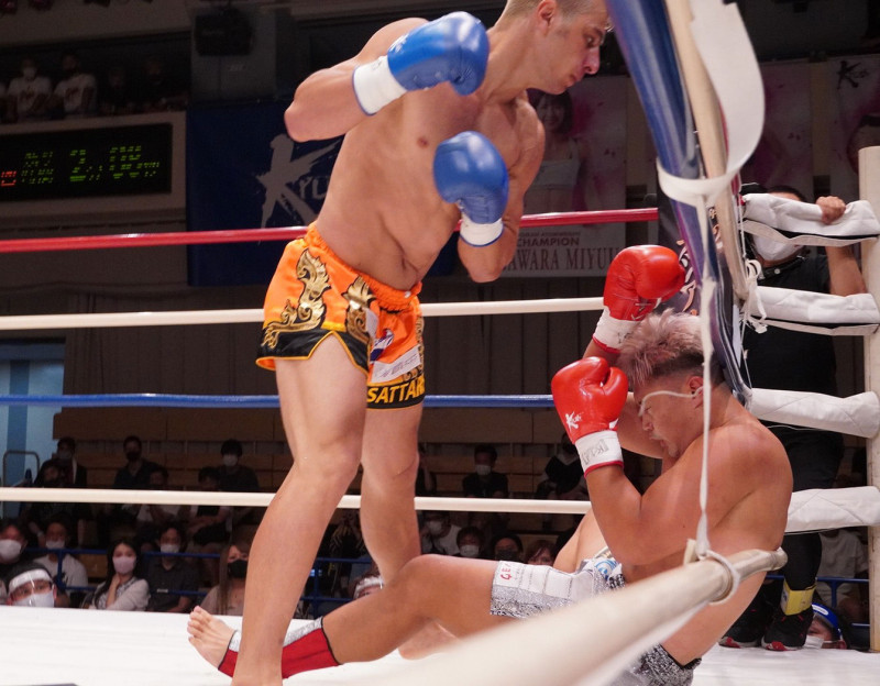 左フックで谷川(右)から最初のダウンを奪うサッタリ