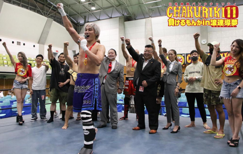 メインイベントの6人タッグマッチで勝利したK-1 JAPAN軍の中迫剛(中央)、入院中のアントニオ猪木氏に向けて“1、2、3、ダー!”でエール