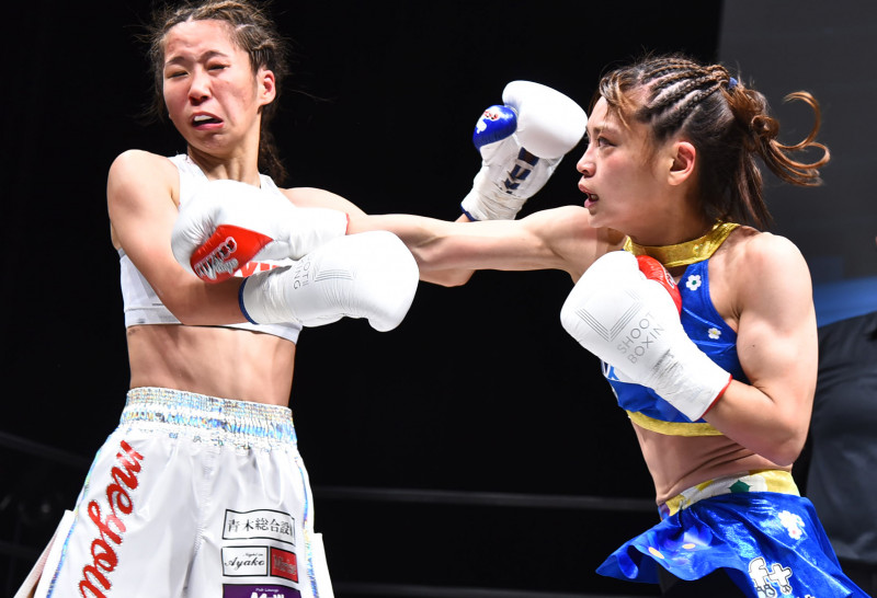 坂田(左)に右ストレートを当てるMISAKI(右)