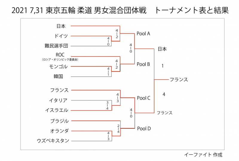 1回戦からのトーナメント表に赤線とスコア、全結果