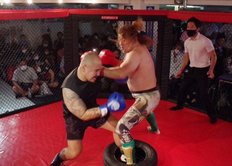 無差別級タイヤ神・内田(右)が逆転勝利し、防衛を果たした