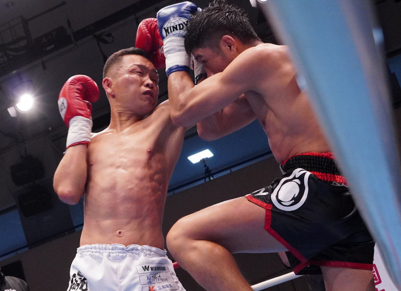 駿太(左)が強烈な縦ヒジを見舞う、タイ人を相手に完勝を収めた