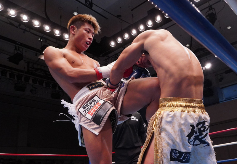 戸井田(左)が強烈なヒザ蹴りで攻めていく