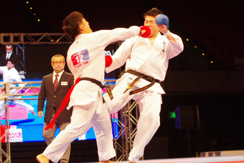 決勝戦、花車は一昨年のフルコンの部の全日本王者・伊藤に上段突きがヒットしポイントを奪う