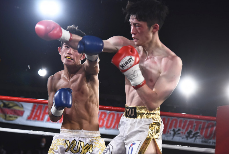 合計3度のダウンを奪い、平松侑(右)に圧勝した林佑哉(左)