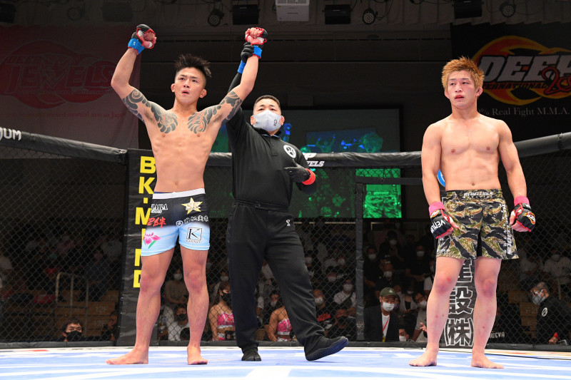 勝ち名乗りを受ける杉山(左)(C)DEEP
