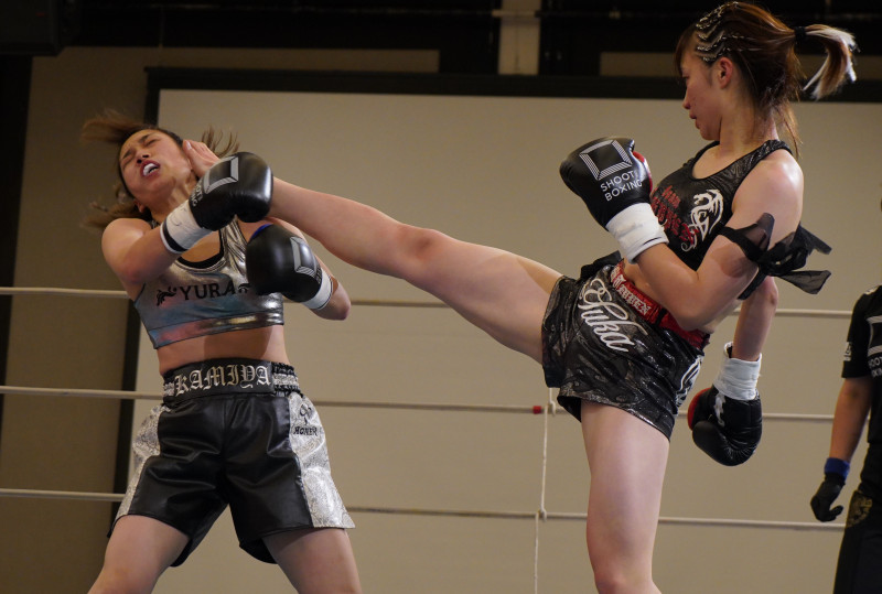 神谷(左)に顔面前蹴りを放つ村上(右)