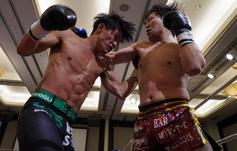 阿部(右)と激しく打ち合う奥山(左)(C)YCC/MAXFC