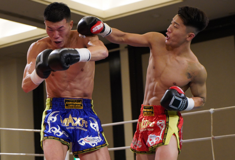 五十嵐(左)を右ストレートでKOした井藤(右)