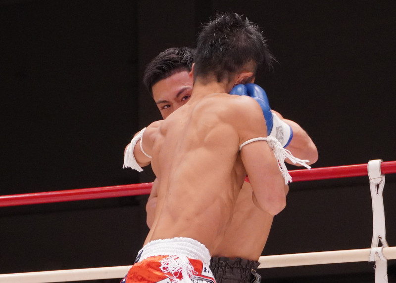 永坂の左フックが三井のアゴに食い込む瞬間! この一撃でKO勝利
