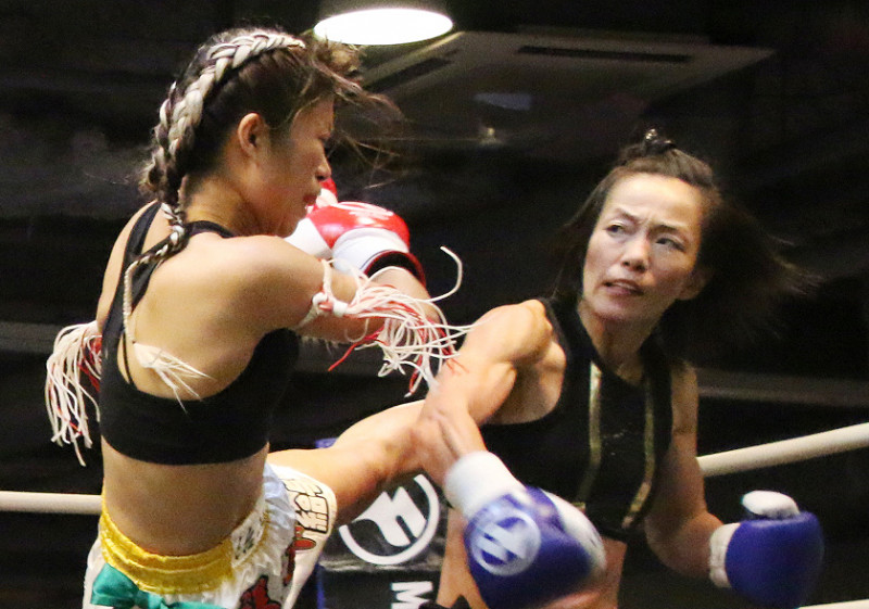 久遠 (左=渡辺久江)のパンチに祥子JSKがミドルキックをヒットさせる