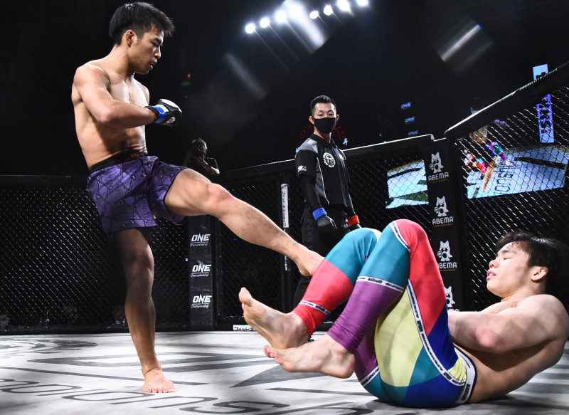 高橋(右)に蹴りを見舞う山内(左)
