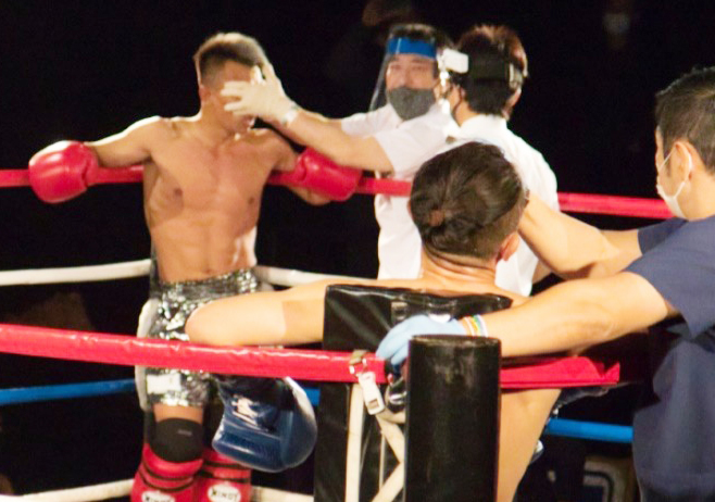 バッティングで両者流血し同時にドクターチェックされる珍しい場面。特に解体屋社長(奥)の流血は大きかった