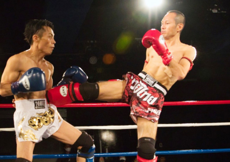 バーテンダーとして働きながら王座防衛を果たした大津が得意のミドルキックを炸裂させる