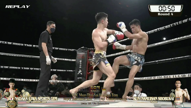 左フックを当てる名高(左)(BOM映像スクリーンショットより)