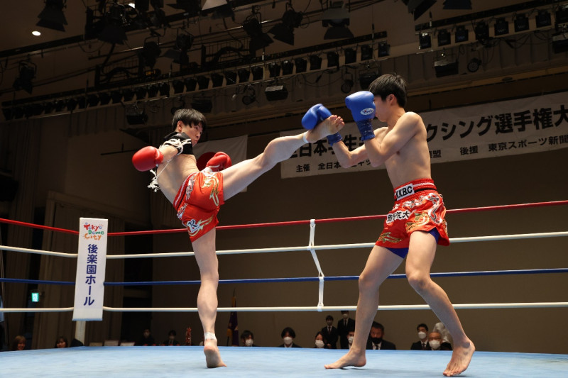 1R 菅原(左)の右ハイキックをブロックする高岡(右)