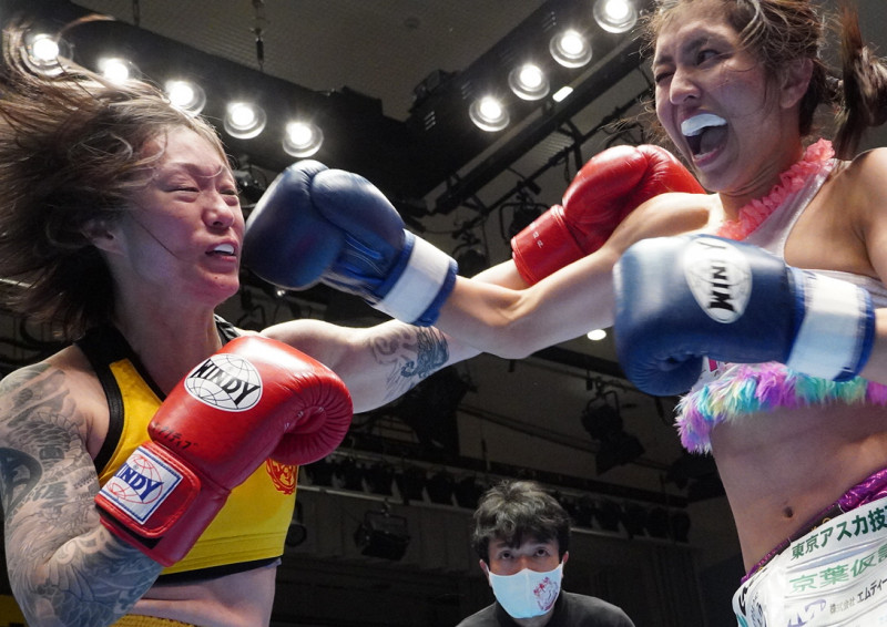 sasori(左)がぱんちゃんと激しく打ち合う