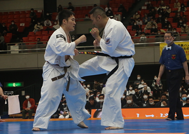 右脚スネでのローを効かせる入来