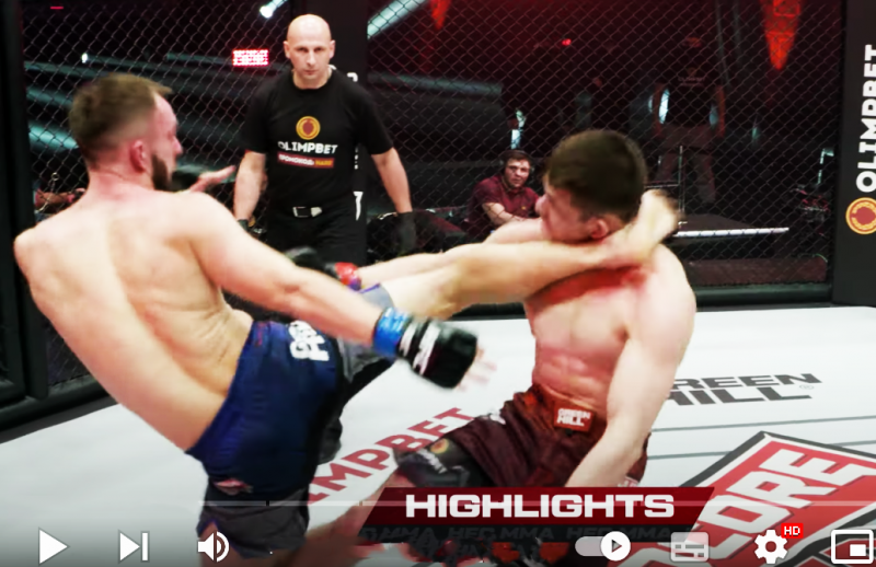 戦慄のハイキックからトドメの馬乗りパンチ連打、秒殺KO!(HFC MMA公式YouTubeより)