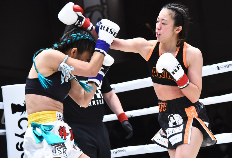 祥子(左)から3度のダウンを奪ってKO勝ちした小林(右)