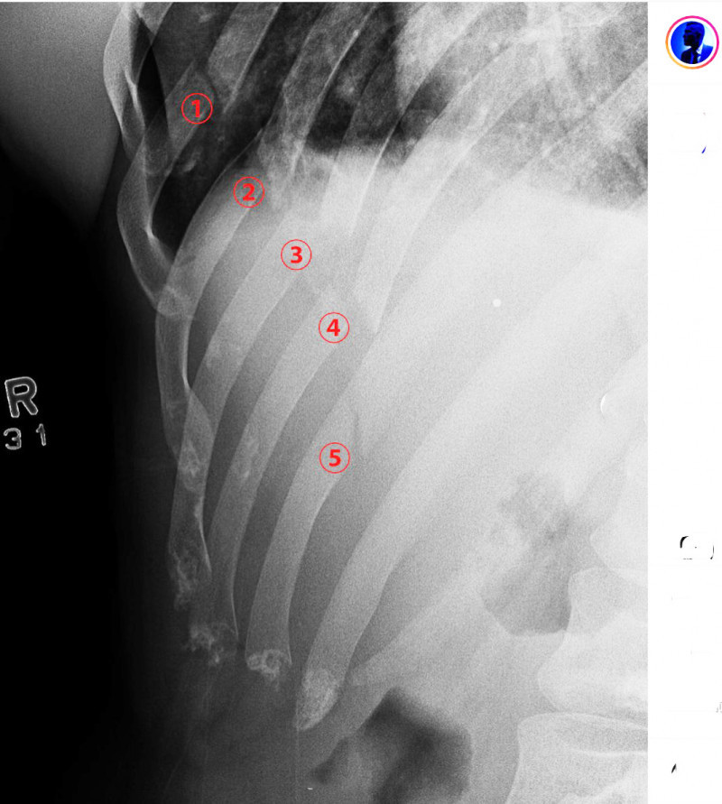 拡大レントゲン写真、肋骨5箇所が折れている@blackeagle_170より
