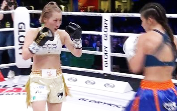 TKO負けしたものの、“大和魂”の戦いを見せた愛三(左)@glorykickboxingより