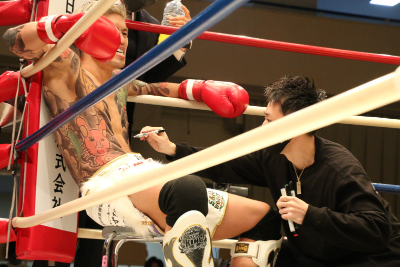 インターバルでは城戸のセコンドが、消えてきたペイントを修正する小技も見せた