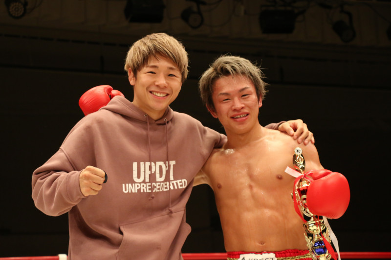 晃貴(右)はセコンドの武尊と笑顔で勝利を喜んだ