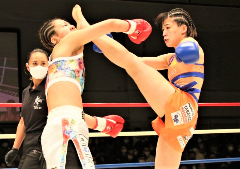 Krush初参戦の鈴木(右)は上段前蹴りを真優に決める