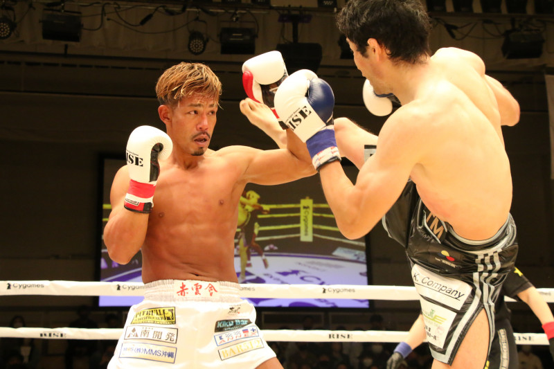 宮城(左)はパンチで勝負をかけたいが森田の蹴りで封じられた