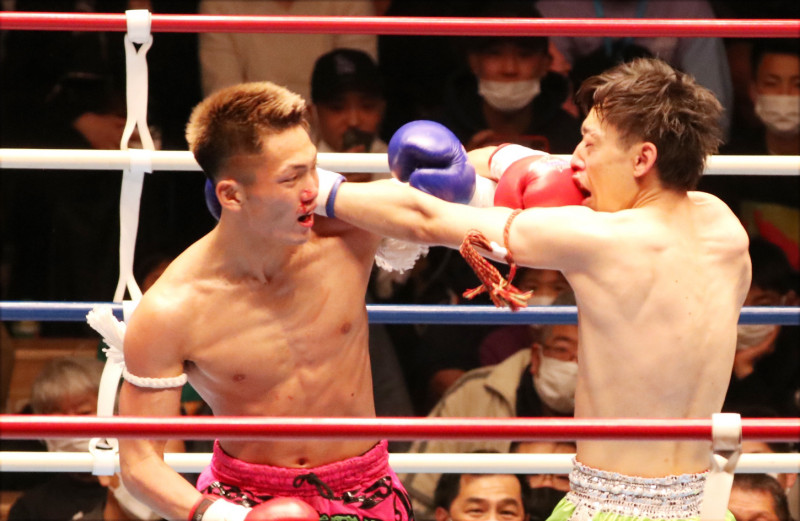 左フックをクリーンヒットさせるユウ44(左)