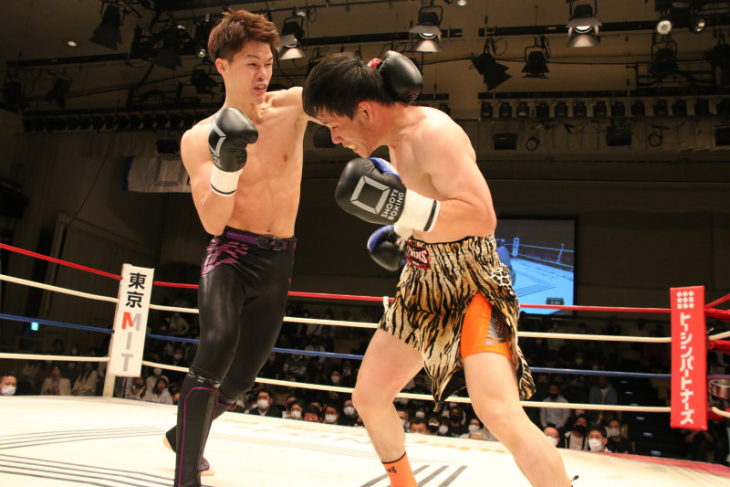 村田(左)はパンチとヒザ蹴りを決めていき越智からKO勝利