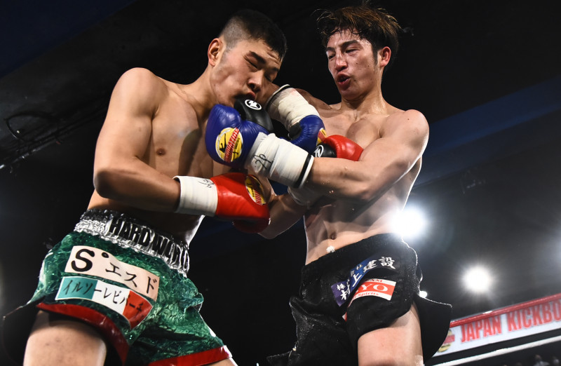 井上(左)に右ヒジをヒットさせた岩城(右)