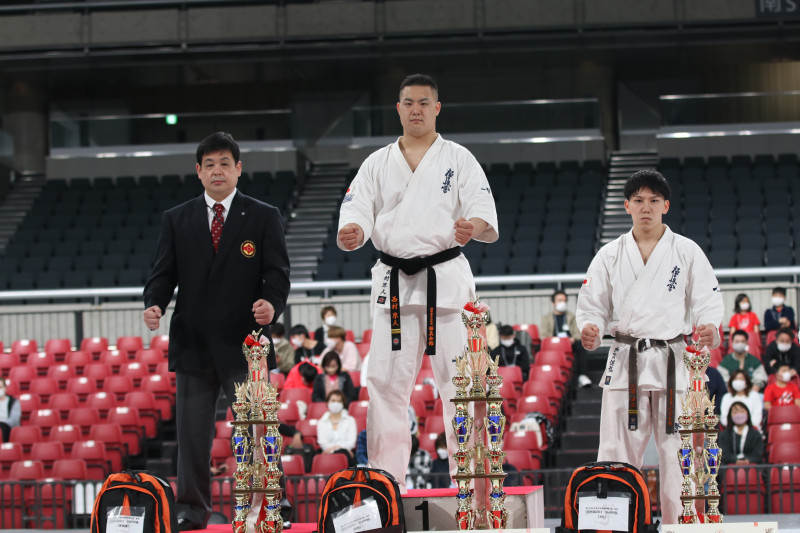 優勝した西村。左の2位の山川の代わりに、西村と山川の師範である川本英児支部長が立った。3位は加賀(右)