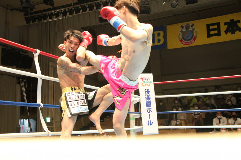 1Rに右ハイキックでダウンを喫した海老原(左)
