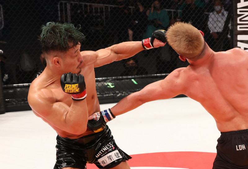 大尊伸光(左)がパトリックをパンチで攻める