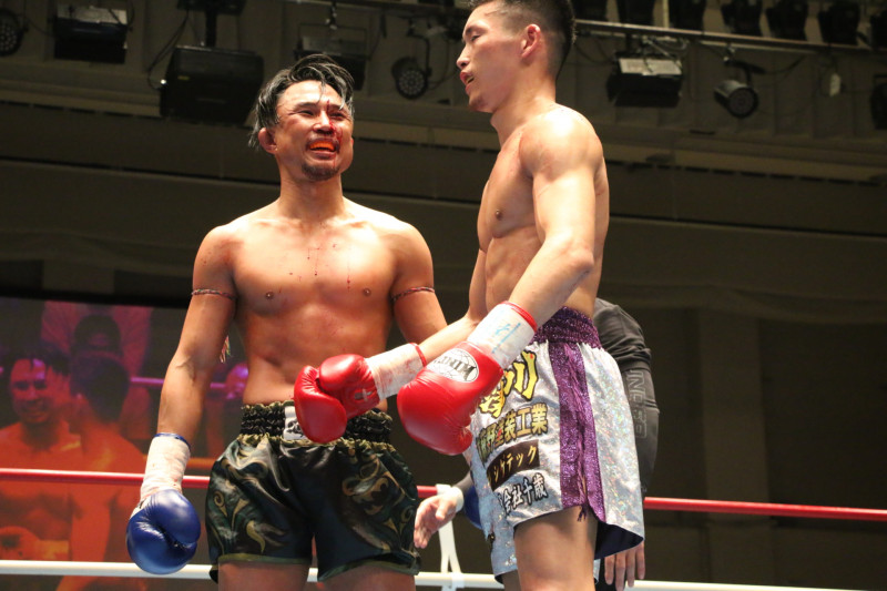 ヒジ打ちでTKO勝利をものにしたバズーカ(右)