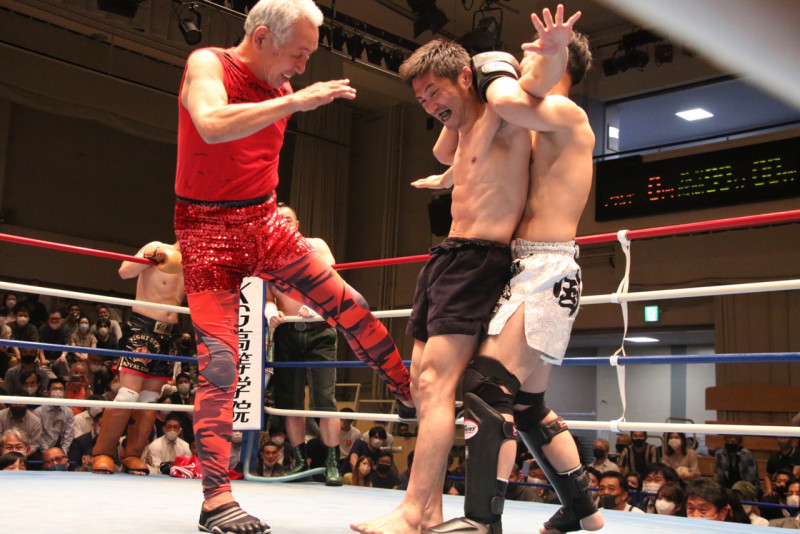 国崇(右)が藤原あらし(中央)を羽交い絞めにして、藤原敏男が蹴りの連打
