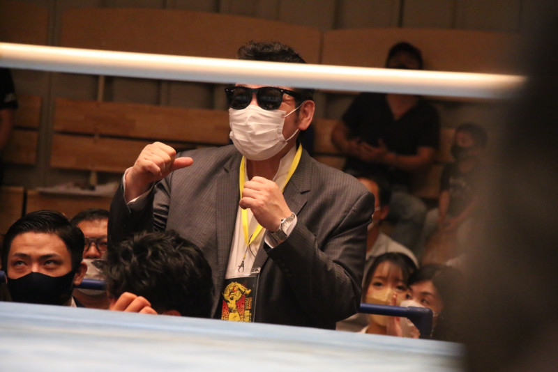 リングサイドでは闘病中の佐山聡が観戦。藤原敏男のエールにファイティングポーズ