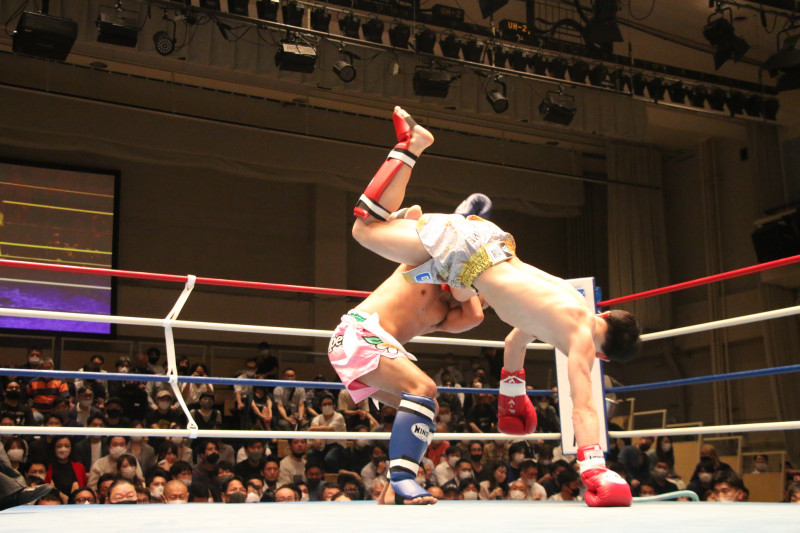 サンチャイを相手にセンチャイキックで攻撃する吉成