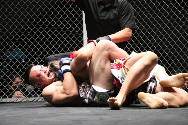 粕谷(左)は平からチョークスリーパーで一本勝ち